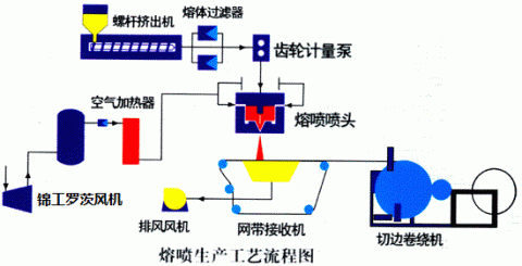 三,噴絲模頭。這個(gè)是熔噴布機(jī)的最重要部位。有1塊長(zhǎng)條形噴絲板,板上布滿一長(zhǎng)列噴絲孔,一般每m長(zhǎng)約有1500個(gè)噴孔。噴絲板兩側(cè)面裝有熱空氣噴管,下裝有熱空氣噴孔,與噴絲孔成50b角,使纖維噴出之后,即刻用高速熱空氣進(jìn)行氣流拉伸,把纖維吹斷,成為超細(xì)纖維。 產(chǎn)線都會(huì)有配,設(shè)計(jì)和精度直接影響拉絲的長(zhǎng)度、均勻性、韌性、細(xì)度等諸多方面,從而對(duì)最終的卷材質(zhì)量產(chǎn)生決定性影響。